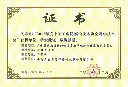三圣石墨的“易水解熱敏性物料低溫多效節能濃縮技術(shù)與裝備”獲得中國工業(yè)防腐蝕技術(shù)協(xié)會(huì )頒發(fā)的科技進(jìn)步二等獎。此次評獎一等獎空缺,我公司獲得的獎項為石墨設備行業(yè)唯一的一個(gè)二等獎。