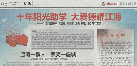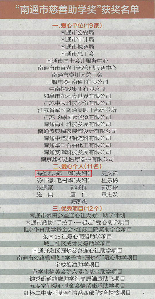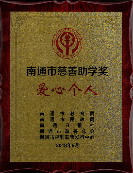 2018年8月15日,南通市教育局、南通市民政局、南通日報社、南通市慈善總會(huì )、南通市福利彩票發(fā)行中心公布了“南通市慈善助學(xué)獎”評選結果,南通三圣石墨設備科技股份有限公司董事長(cháng)馮圣君、鄭輝夫婦榮獲“南通市慈善助學(xué)獎愛(ài)心個(gè)人”光榮稱(chēng)號,全市僅有11人獲此殊榮。